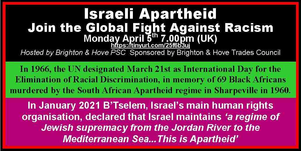 And lastly I intend to say a few words on behalf of Brighton Palestine Solidarity Campaign. The meeting is sponsored by Brighton & Hove Trades Union Council and I hope that as many people as possible will be able to attend. (Register here)