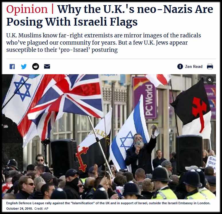 In this country the EDL, Britain First and other fascist groups have long displayed Israeli flags on demonstrations. Tommy Robinson has stated that he is a Zionist. The neo-Nazi founder of the alt-Right, Richard Spencer, openly declares that he is a ‘White Zionist’.