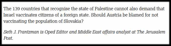 In the first article, after having said that ‘Israel is not responsible for the health care of the residents of the Palestinian Authority’ i.e. those living under the Occupation, Frantzman went on to declare, in his final paragraph that since 139 countries recognise the non-existent state of Palestine, then demanding that Israel fulfills its obligations under Article 56 of the Fourth Geneva Convention, to provide health care to those living under occupation would be akin to demanding that Austria vaccinate the population of Slovakia!