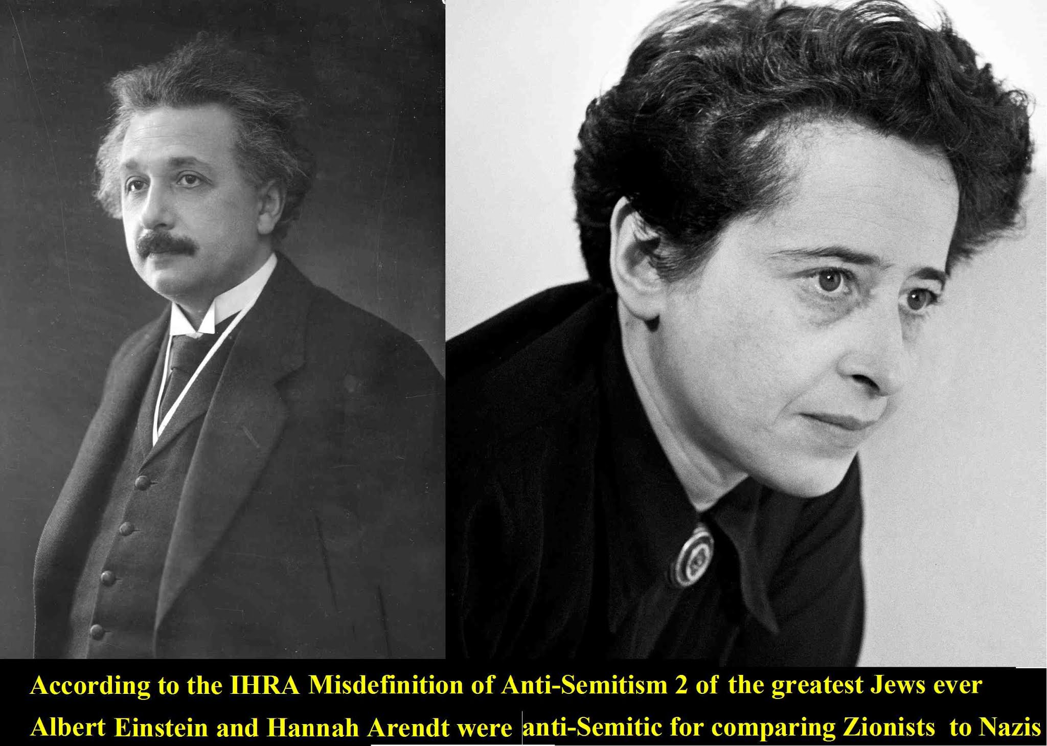 As Neve Gordon and Mark Levin point out, under the IHRA two of the greatest Jewish personalities of the 20th century, both of them refugees from Nazi Germany, Albert Einstein and Hannah Arendt, have to be classified as anti-Semitic! In 1948 when Menachem Begin, the leader of Herut visited the United States they signed a letter with other Jewish personalities, to the New York Times claiming that Herut was: