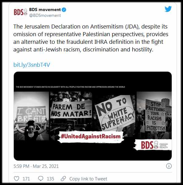 Unlike the IHRA misdefinition of anti-Semitism, the JDA is concerned with anti-Semitism not tarnishing the struggle of the Palestinians and opponents of Zionism as ‘anti-Semitic’.