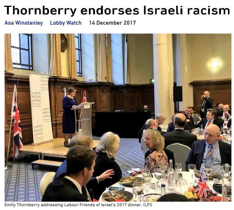 In what Asa Winstanley called ‘a groveling address in front of the Israeli ambassador at the Labour Friends of Israel annual dinner’ in November 2017, Thornberry declared that