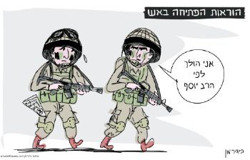| Zionist humour – on being issued with new shoot to kill regulations, the soldier says that he’s with the Rabbi on this one, in other words he prefers to expel all those under his command |