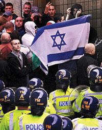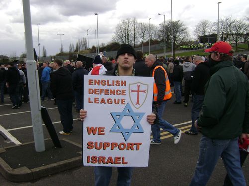 | EDL demonstrators in Brighton, after having failed to attack PSC stall – with Israeli flag |