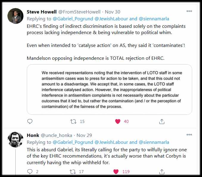 Likewise its finding that interference by the Leader of the Opposition’s Office into the anti-Semitism complaints was a form of indirect discrimination is untenable. This action has to be detrimental to those affected yet nowhere does the Report state why that is so or who suffered a detriment. If permanent staff were running their own campaign targeted at e.g. anti-Zionist Jews then such interference is perfectly acceptable.