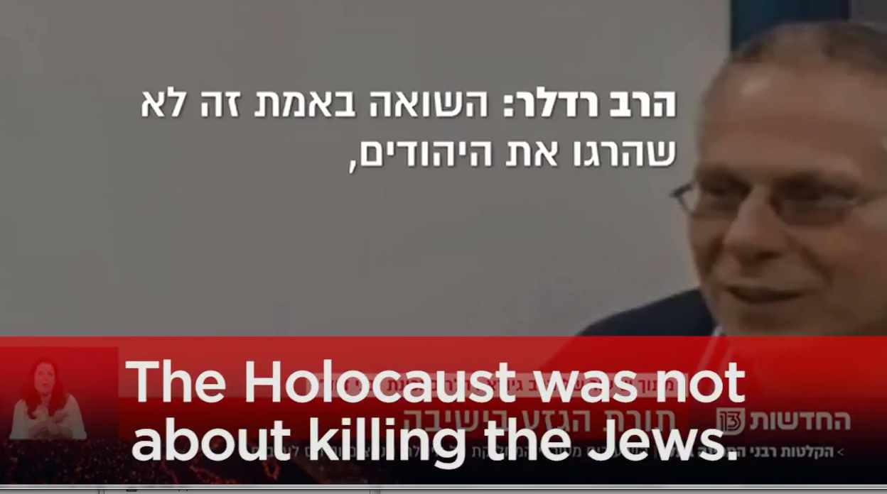 According to Rabbi Giora Radler the Holocaust was a ‘divine punishment’ designed to ‘encourage’ Jewish people to leave the diaspora and that the true Holocaust “is secular culture in which we believe in man, that is the Holocaust.”